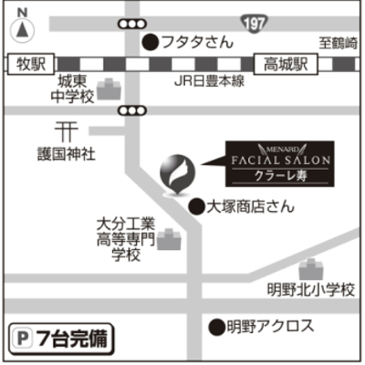メナードフェイシャルサロン クラーレ寿 住所:大分市東原1−1 護国神社入口交差点を明野方向へ進み、坂を上った左側です。